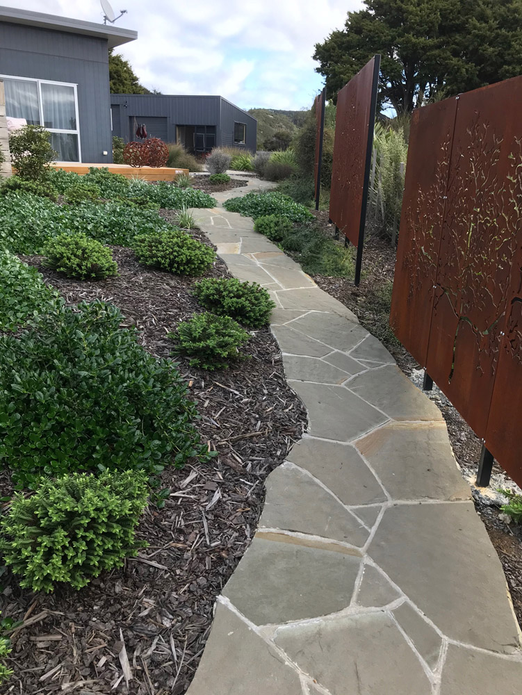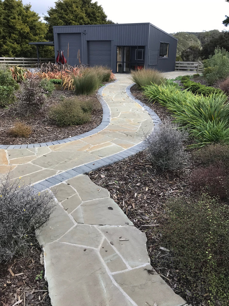 If you are after a more rustic finish laying Paradise Stone directly on a sand base and edging with pebbles or sand is a good option. This style melds well with pebble or pumice pathways in a garden setting.