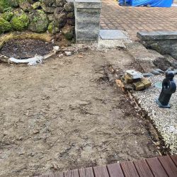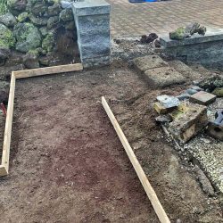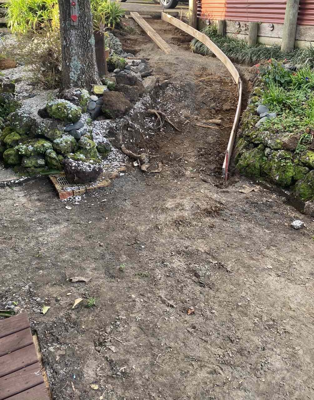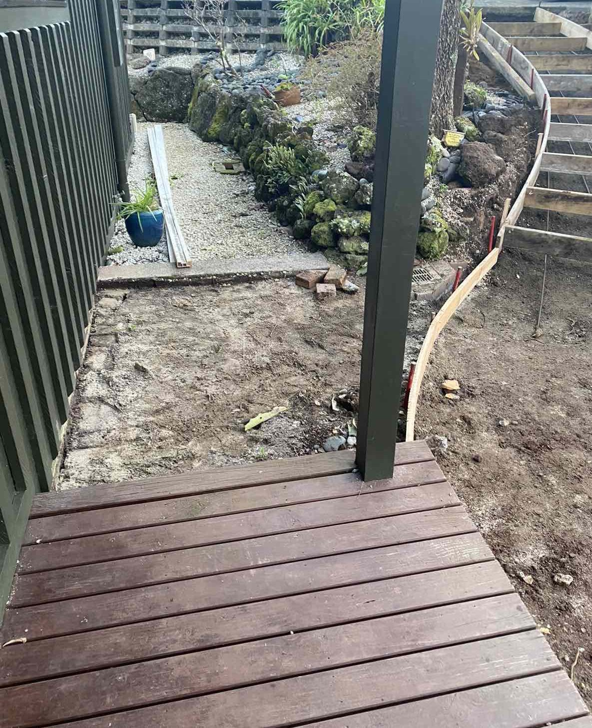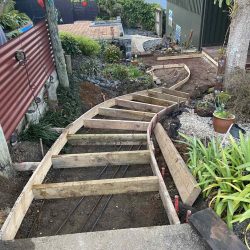 Once on site our team began by preping the area, firstly removing all the old uneven bricks. Then creating smooth even surfaces to lay the new pavers down. After removing the old steps which led down to the house our team installed a timber boxing which allowed a precise new concrete foundation to be poured for the curving steps..